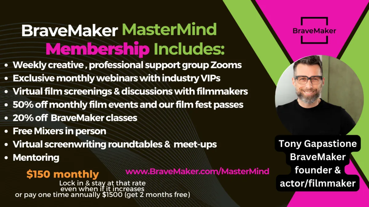 BraveMaker membership is for actors, writers and filmmakers who want professional development, support and accountability to create. Monthly sessions are aimed at supporting and educating makers to create and follow plans to achieve their goals.